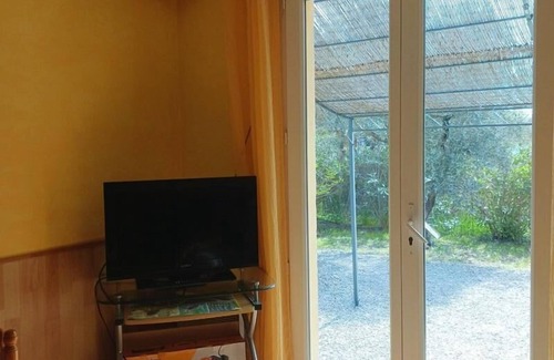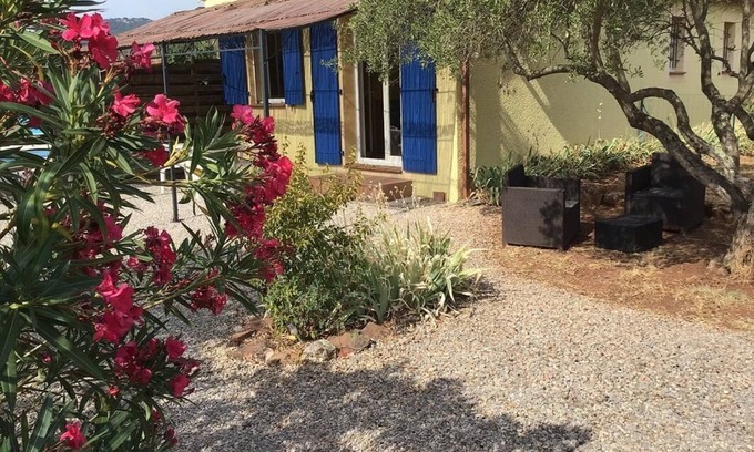 Quiet with beautiful view over the massif des Maures, Nice cottage on beautiful private garden closed 400 sqm, fully independent with private gate entrance, parking. Terrace gravelled garden with deckchairs under the olive trees. Located between sea and mountain, ideal for exploring the region. Municipal swimming pool 3 km. Ground floor: entrance living room with corner kitchen, 1 bedroom with 1 bed 2 pers in 140cm, bathroom with wc. Electric heating. Mobile air conditioning. The owner offers his washing machine one to two times a week.