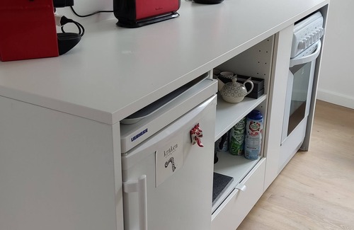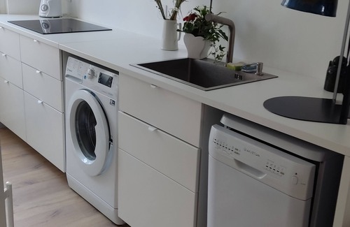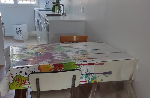 The kitchen is equipped with an oven, a stovetop, and a refrigerator, as well as a coffee maker, an electric kettle, and cookware. Bathroom amenities include a hair dryer and towels. And because there's access to laundry facilities, you can go a bit lighter on your packing. Other amenities include bed sheets, air conditioning, and a dining table.
