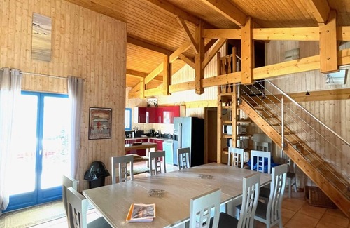 Wooden chalet style VILLA of 240 M² with garden of 2000 M² not overlooked, with private, covered swimming pool, heated from April to mid-November, 6-seater covered jacuzzi with a telescopic shelter, sauna.