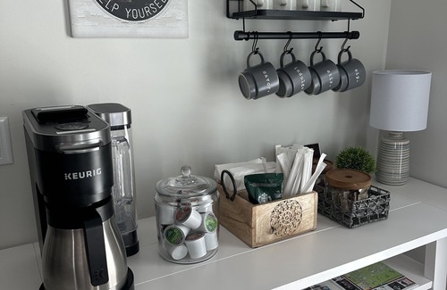 Essential Amenities: Complements to your stay include quality new furnishings, fluffy white towels, organic bath products, and a coffee and tea bar, providing all the comforts needed for relaxation and enjoyment.