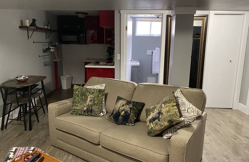 Basement suite with a private Entrance, only couple minute walk from downtown Jasper. Kitchenette, King bedroom, with pull out couch. Our tourist suite is located in the basement of our family home. Cozy getaway located in the heart of the beautiful Rocky Mountain. Our kitchenette has NO OVEN OR STOVE but we do provides an induction burner, microwave, full size fridge, toaster, kettle, coffee maker, pot and pans, glassware, plates, cutlery, utensils, cooking utensils, basic spices, oils, paper towel, and linens. Our bathroom has towels, toilet paper, soaps, first aid kit, and other complimentary toiletries. Linens are included for our double pull out couch, and king size bed. We also include an extra blow up mattress and kids pack n play in the closet. There is an assortment of board games, cards, and kids toys for your enjoyment. Our living room has a Roku tv, with cable, Netflix and other streaming networks are available with your own accounts. Wireless internet provided. We do have small kids that live upstairs in our family home, we do our best to keep them quiet during sleeping hours but you may hear them from time to time. There is a Large private outside patio area with BBQ, prep station, patio furniture, and outdoor dining set for your enjoyment, it is located just outside the doors to your suite. My name is Lena and I live on site to answer any questions you may have and to assist you with your stay. Self check in system with key located in lock box on the door to your suite. Parking available located in front of the entrance to suite.