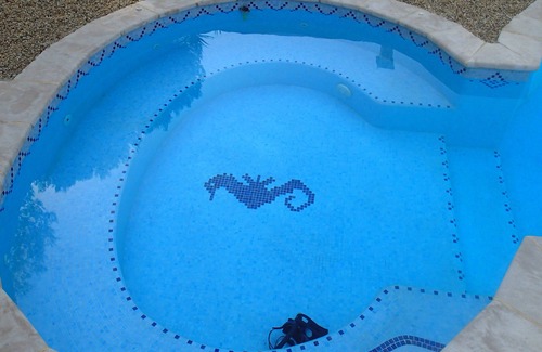 Magnificent private swimming pool without any opposite, with a small bubbling pool and a bench seat for moments of relaxation.