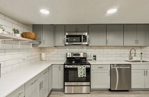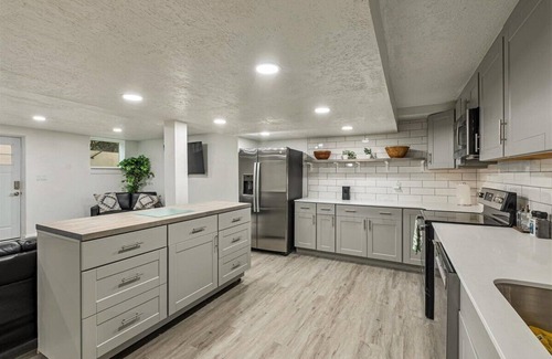 Experience comfort in our basement Provo retreat! Dive into our 3-bed, 2-bath haven, designed to offer an amazing family escape. Unwind in the cozy living area, cook a meal in our stocked kitchen, and strike the perfect work-life balance with our designated workspace. Outside, embark on a journey of fun in our backyard, featuring a treehouse, swing set, and trampoline. Your perfect home away from home is here!