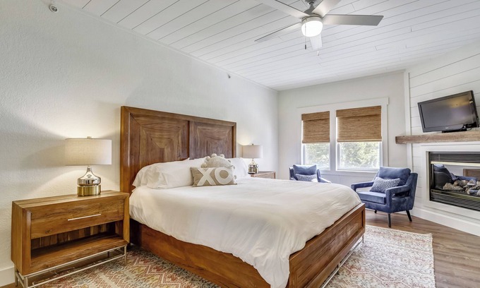 Enjoy the plush king size bed, 12" memory foam mattress under crispy white bedding and a gas fireplace within a shiplap facade and barn beam mantle. WIFi and cable TV are readily available in your room.