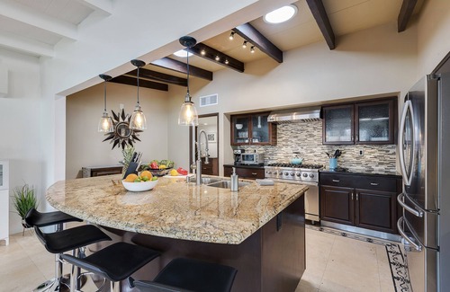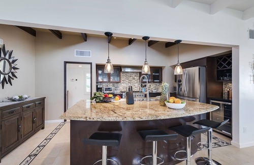 The front gate opens up to a large palm tree fountain courtyard with front yard spaces and sidewalks leading up to the home. The front hallway allows you to pass directly into the formal living room to the left, or, to the right, head on into family room and kitchen. The formal living room opens out to the front sidewalk through double sets of French doors with a gas fireplace and plenty of room for lounging and relaxing as well as a sleeper sofa. The family room sits off the gorgeously updated kitchen and beside the casual indoor dining area. The family room boasts a large 60” flat screen smart TV and views of the outside pool area. The granite island kitchen includes high end stainless appliances, a refrigerated wine cooler, buffet table and a long breakfast bar area as well which seats up to four comfortably. Dinner can easily move to the indoor dining area that seat ups to 6 comfortably or exit out either set of French doors to the covered patio and dine al fresco poolside!