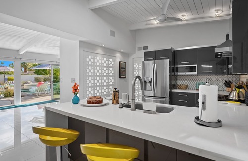 Secluded on a quiet cul-de-sac of beautiful homes, PS Swanky offers stylish entertaining inside and out with gorgeous mountain views. Terrazzo tile floors greet you at the entry and flow throughout the home. Just off the entry, guests who would prefer more privacy can enjoy an ensuite Queen guest bedroom that is separated from the homes’ other bedrooms. Back in the entry hallway, the remodeled powder room features fixtures as seen in the James Bond movie, Goldfinger. The entry hallway leads you into a spacious great room with ample seating and a martini bar. Vintage Midcentury features of the home are showcased here, including vaulted tongue & groove ceilings, original stone fireplace & breezeblock accents, lighted naturally by huge expanses of windows overlooking the pool. To your left is formal dining for eight with views out to the extended, saltwater pool and waterfall (pool heat is an optional/additional charge. See house rules for additional information). The updated kitchen features quartz counters, stainless steel appliances, a wine refrigerator, cozy breakfast bar and ample storage.