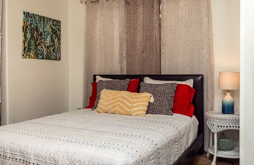 This ground-level retreat features a private entrance and parking. Soak in the serene country living experience as you pick fresh tropical fruit from our trees, including mango, lychee, and avocado. Perfect for couples or families, featuring a fully equipped kitchen and an outdoor seating area. The large bedroom boasts a California King bed and a Queen Bed separated by a room divider, each beneath ceiling fans to keep you cool at night. The bathroom includes double sinks and a standing shower, with an outdoor shower nearby, ideal for rinsing off after a day at the beach. A private washer and dryer are designated for exclusively for your laundry needs during your stay.