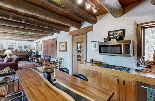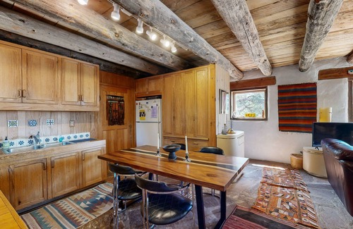 This dog-friendly home offers complimentary Wi-Fi, a wood-burning stove, an outdoor grill, and parking for three vehicles. Although this home is not equipped with AC, it is rarely needed with Santa Fe’s mild weather at 7,000’ elevation. Fans are also available.