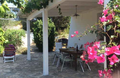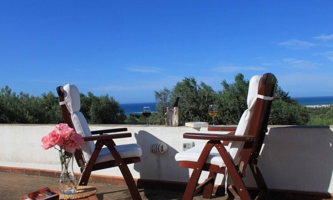 Villa Morocco is a beautiful Mediterranean villa, surrounded by a mature, extensive, and luxuriant garden, all fences The villa stands in a magnificent sea view location between the coast villages of Pescoluse and Torre Pali. The villa is very close (only 1500 metres) to the beautiful white sand beaches and crystal-clear Ionian Sea (blue flag). The famous cliffs and caves are also near, just 9km away. Villa Morocco is conveniently situated for sightseeing as it is quite near (only 7 kilometres) to the highway, thus making the tourist towns easy to reach. The villa is shaded by tall pine trees and in its grounds there are also olive, citrus and fruit trees, flowers and rose bushes, and the aromatic plants of the Mediterranean bush. The villa is built around a large inner court with potted plants and it is divided into self-standing, completely independent properties. Each property has two doors, (one leading to the patio and one to the inner court), its own private outdoor areas (large shaded patio, roof terrace) in addition to the villa garden, and a covered parking space inside the gates. From the villa and the grounds you can enjoy delightful sea views.