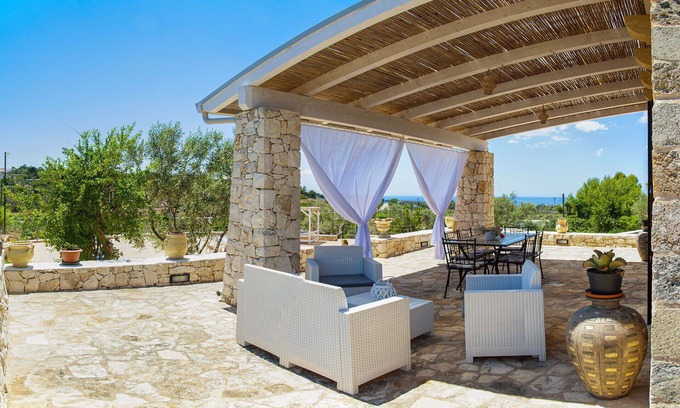 Villa Luce is a fantastic and exclusive "liama" sea view, on a plot of 5000 square meters, just 1.5 km from the sea surrounded by greenery among olive trees and ornamental plants. Its typical Salento construction, in stone and with typical barrel vaults, is located in the panoramic area of Santa Maria di Leuca, which is why it represents an oasis of tranquility. Garden with plants typical of the area. Above-ground swimming pool of about 32 m2 (8x4) to entertain young and old. There are several shaded areas, ideal for experiencing moments of pure relaxation. The ancient stones present in the building revive moments of the past.