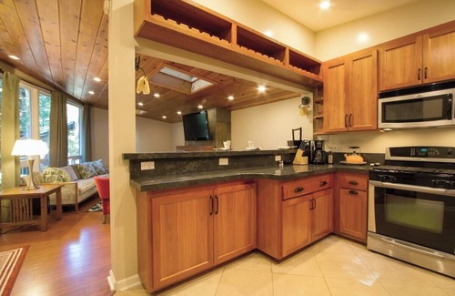 The modern kitchen is well-equipped for cooking, though hosting a dinner for 6 adults would be the comfortable limit in this the compact home. It features stainless appliances: refrigerator is full size with bottom freezer; dishwasher has independently operated upper and lower chambers; propane fuels the instant delivery hot water heater, range with self-clean oven, both fireplaces and outside deck placed BBQ.