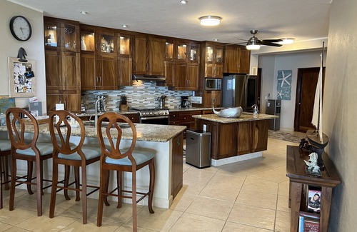 The second bedroom has a queen sized bed with a U.S. pillow top mattress, and new bedding. We also have a twin bed with a topper and new bedding in this room. All mattresses have a zippered protective cover under the mattress pad. There is a comfy queen sized sofa-bed in the family room with a topper that you are welcome to use. Both bathrooms come fully equipped with fluffy towels, as well as soap, shampoo, and conditioner for your stay. The kitchen at Cayo Loco is truly a chef's kitchen with all stainless steel appliances including a wine refrigerator! You will also have access to all dinnerware, silverware, stemware and cookware. The sink in the kitchen island has a reverse osmosis water purification system. We have a 5 gallon water jug dispenser with cold and normal water temperature options in the kitchen with complimentary refills! Each room has an air conditioner controlled by a remote, as well as ceiling fans to keep you nice and cool. We have all the modern conveniences of home, including Wi-Fi, Fiber-optic Internet, USB ports in every room, a new 65" Smart TV w/sound bar, and an amazon firestick.. There is also a DVD player with lots of movies to choose from. Of course if you came to Mexico to unplug, there are board games, cards, and a take and leave library of books as well.