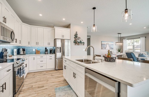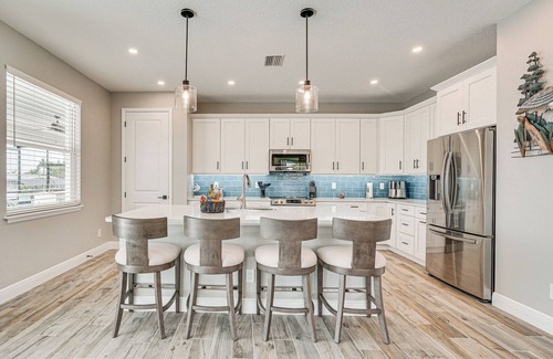 OUTDOOR LIVING: Lanai, patio, bar seating, gas grill (propane provided), refrigerator, sink, lounge seating, private pool (heated w/ nightly fee), pool towels, child safety pool fence, cornhole, darts, backyard, 2 bicycles