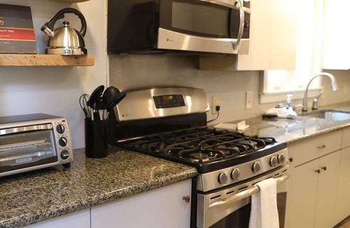 You'll enjoy entrusting your stay to this private home. Hopefully the home will help you enjoy your stay with all its amenities. Starting in the foyer, there are three options. Turn to your left to walk into the expansive living room with an adjacent den having a wall of windows that look out to a landscaped backyard and surrounding mature trees. The den features a pull-out queen size sleeper sofa, a 40" flat screen TV with Roku, shelves of games, and black out curtains. The living room features comfortable sofa and chairs, a 40" flat screen TV with Roku, a fireplace, and a foosball table. The living room also opens up into an office connected to the kitchen, a convenient half bathroom, and a hallway that takes you back to the foyer. The foyer is also the base of the stairs leading to the second floor. Starting back again in the foyer, turn to your right to enter the dining room where you can enjoy a dinner cooked at home, or delivered from one of our many nearby restaurants. The dining room features: a dining table with seating for 8 people. The dining room also connects to the kitchen. The fully equipped kitchen features everything you need to cook meals at home. An expansive pantry and laundry room round out the interior first floor. Stairs lead up to the second floor bedrooms and two full bathrooms. After a busy day, soak in either bathtub, walk on the radiant heated floor in the main bathroom, and soundly sleep in any one of the three quiet and restful bedrooms which have triple paned windows. Each bed offers: queen size memory foam mattresses, eco friendly sheets, and blackout curtains.