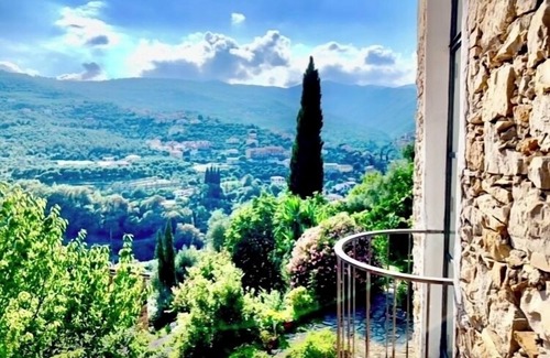 Die gemütliche, helle Bambola - über 2 Etagen - mit eleganten, großen Eisenfenstern, bzw. Türen mit kleinen Balkonen ( Terrassinos) ist liebevoll und farbenfroh eingerichtet und bietet eine traumhafte Aussicht über das Tal und die Berge mit den wunderbaren Dörfern, bis nach Dolcedo.