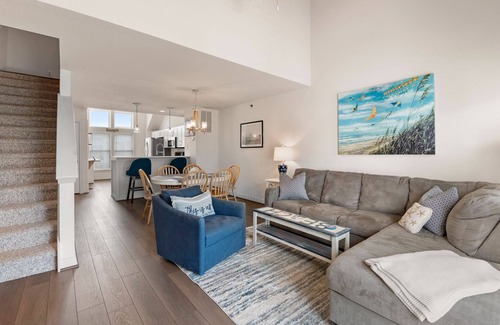 On a quest to find the perfect combination of amenities and affordability? Then Bermuda Bay is your oyster and this OBX townhome is your pearl! Purple Pearl features four separate levels that can easily accommodate family and friends. You'll find updated finishes throughout, including LVP flooring and gorgeous ceramic tile in the remodeled bathrooms. The chef in your group will appreciate the fully renovated kitchen with stainless steel appliances, quartz countertops and a coastal-inspired shiplap accent wall. After a day at the beach or by the pool, come home and relax in the comfortably furnished great room featuring vaulted and 9' ceilings for a bright and airy atmosphere. The open-concept layout provides sightlines from front to back and encourages quality time spent together. A slider lets in an abundance of natural light and leads to a spacious deck with pergola for outdoor lounging. The mid-level consists of two bedrooms, one of which has access to a covered deck. Both bedrooms include ensuite baths for plenty of privacy. For additional sleeping arrangement options, the loft is furnished with a king bed and bunkbed set. Downstairs, the rec room provides another space for gathering. It's furnished with a mini foosball table and leads out to a covered patio with grill.