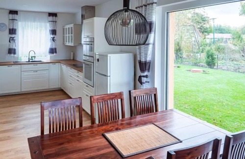Large single-family house "Pusteblume", built in 2020. In the district of Hessenburg 11 km from the centre of Ribnitz-Damgarten, in a quiet position, 5 km from the sea, 15 km from the beach. For shared use: property 1'700 m2 (fenced), well-kept garden with lawn, parking on the premises. Supermarket 8 km, restaurant 8 km, bus stop "Saal" 4 km, sandy beach "Zingst" 15 km, grass beach "Saal" 3 km. Surf school 4 km. Nearby attractions: Boddentherme 11 km, Vogelpark 16 km, Bernsteinmuseum 9 km, Karls Erlebnishof 30 km, Hansestadt Rostock 40 km. The owner does not accept any youth groups. Please note: the owner lives on the same property. Neighbourhood highly sensitive to noise. Quietness and good behaviour expected. The owner occasionally lives on the property.