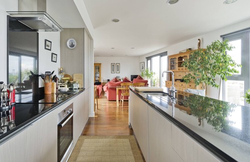The sleek kitchen features a breakfast island with bar stools and all the appliances you need for self-catering, including an induction hob, oven, extractor, and dishwasher.