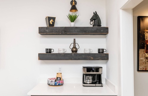 Our home offers a king suite, a queen bedroom with a bathroom around the corner, and a pullout bed too. Each bed has a top of the line mattress for your comfort. Each bedroom, as well as the living room, is equipped with a smart TV for nights you just want to stay in. But if you’re in the mood to be outside, we have a Calospa hot tub (covered), an outside bar & fire table, and even a putting green for activities. We have provided a grill with grill accessories, and have all the utensils you need to cook at home.