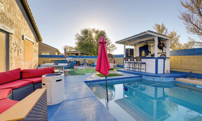 Putting Green & Hot Tub: Goodyear Retreat! is located in Canyon Trails. Putting Green & Hot Tub: Goodyear Retreat! provides accommodation, featuring Private Pool, Balcony/Terrace, Bedding/Linens, among other amenities. This House features Private Pool, Balcony/Terrace, Bedding/Linens, to make your stay a comfortable one.