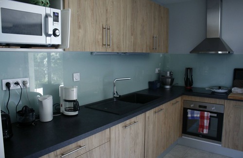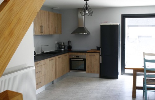 On the ground floor: a bedroom with 1 bed 140, a bathroom and a toilet and a storeroom with washing machine adjacent to a garage for storing bike, ski ... A living room with open kitchen equipped with: dishwasher, oven, microwave, combined fridge / freezer, food processor, coffee maker, kettle, toaster.