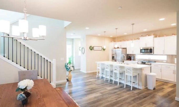 Fall in love with the great room concept on the main floor providing a very social environment for your family and friends. This home’s living room is open to the kitchen and dining room. The dining table seats 8 people comfortably. Relax in the living room’s super comfortable sectional couch, gas fireplace and 65" Smart HD TV. The kitchen with a large island, flows seamlessly to the adjoining dining room, making it the perfect social spot to prepare meals.