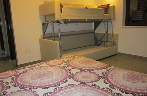 Quadruple room with double bed and bunk sofa bed which in an instant becomes a very comfortable four-seater with the possibility of a fifth additional bed for children.Equipped with every comfort from hot air/conditioning with thermostats in the room, full fridge at no additional cost, desk, wifi, private bathroom with shower, set of towels, Smart LED TV with satellite channels, emergency lights, safe, large bedside tables with drawers, reserved parking, solarium with sunbeds and external shower available for the exclusive use of the rooms directly overlooking Lake Campolattaro and the swimming pool.