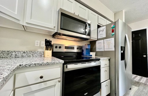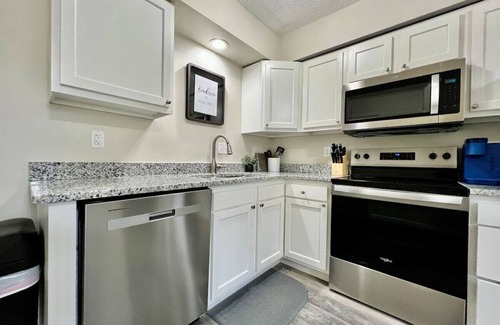 The full kitchen offers a brand new suite of stainless appliances, and is fully equipped with everything you need to cook an enjoyable meal. It has an oven/range, a full-size refrigerator, a microwave, and a dishwasher. There is a table off the kitchen area with seating for four. Sit and enjoy a family meal or game night.