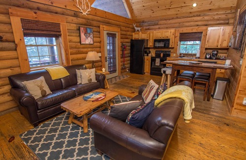 Our cute cabin is waiting for your small family or romantic getaway. As you walk up to the covered front porch equipped with a gas wine barrel fireplace, you will be beckoned to step inside and enjoy the cozy relaxation of natural log wood, while still feeling ample space from the vast, bright cathedral ceiling. The main level will greet you with an open gathering area, which is perfect for chatting over a glass of wine, or watching a movie on the flat screen TV. Firewood is provided for the stone fireplace, so you can create and enjoy the warmth and crackling sounds of a cozy fire. The comfy kitchen has everything you will need to make a romantic dinner or family breakfast. A unique dining table includes cute stools, which creates the perfect place to enjoy each other’s company. A comfortable bedroom appointed with a full bed and bunks, a TV for late night viewings, and an elegant full bath complete the main level. Walk up the gorgeous timber staircase to the private master suite, which includes a king size bed, a full bathroom, and a walk-in closet.