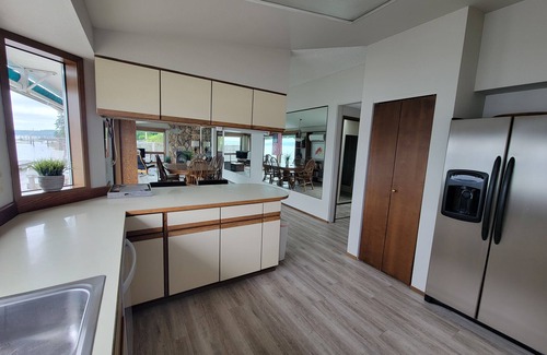 Preble Beach is a two bedroom, two bathroom open floor plan, waterfront rambler. The utility room has a washer and dryer, games and outdoor towels. Both bedrooms have large closets and dressers. One room has a single queen with an ensuite bath, the second bedroom has two twins. The second bath is large and is accessed via common space. The house sits up on a bulkhead, has a huge deck with unobstructed views, stair access down to the beach (shared with our fabulous neighbors), outdoor shower, swim float and parking for two vehicles. The kitchen has a drip coffee maker, toaster, water kettle and is stocked with pots and pans, plates, cups etc. Large dining table inside well as a breakfast bar with two stools, additional dining area outside on the deck.