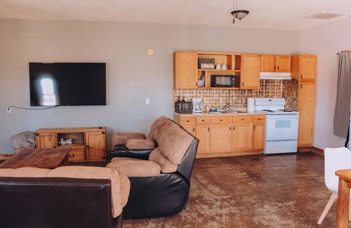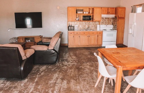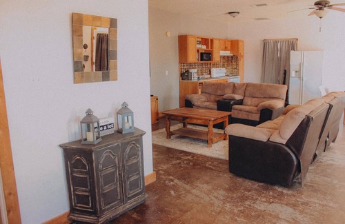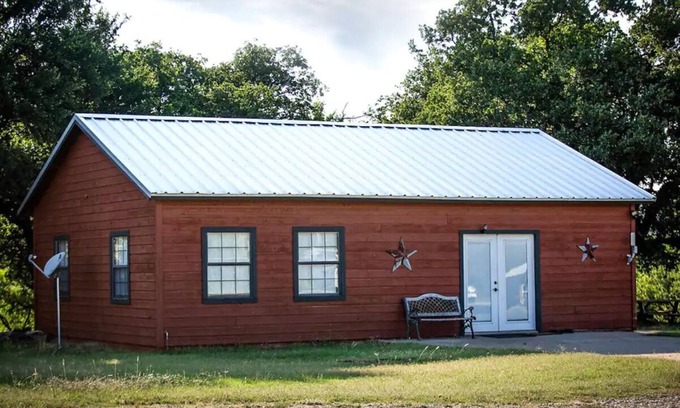 This 900 sqft studio cedar cabin is located on a beautiful ranch in Jacksboro, TX, approximately an hour outside of Fort Worth. Located on 70 acres of land, this space is shared with RV residents and home to antelopes, Jacob sheep, oryx, deer, and George the donkey. Guests have access to a gorgeous lake walking distance from cabin and can explore the serene terrain for a relaxing and enjoyable stay. Wifi available and TV present. Complete with queen sized bed and sofa sleeper, this spot hosts 4 people and is equipped with linens, kitchen utensils and cookware for a comfortable stay. Laundry room located on-site as well.