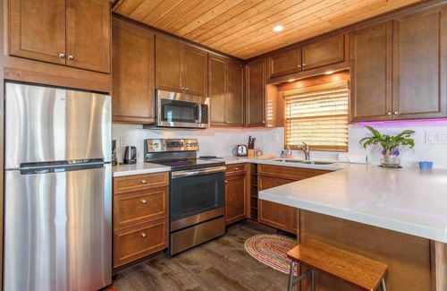 From the moment you arrive, you’ll be mesmerized by panoramic ocean views from the deck. Picture yourself savoring your morning coffee or unwinding with an evening glass of wine as the cool California breeze surrounds you. Inside, the inviting living room offers a plush sofa and comfy chairs by the glow of a fireplace, perfect for curling up with a book or enjoying movie nights on the smart TV. The charming kitchen features fully stocked wood cabinets and stainless steel appliances, ensuring you have everything you need, whether you’re preparing a homemade meal or bringing in takeout from local favorites like the Gualala Seafood Shack.