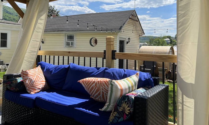 Our cottage is completely stand-alone next to the main house. Guests will have access to the backyard with a fire pit, gazebo, outdoor fireplace, and koi pond (new koi just added!). The cottage features a queen bed, twin futon, mini fridge, television, wireless internet, toaster oven, microwave, dishes, flatware, Keurig coffeemaker, filtered water pitcher, and easy access to downtown Clifton Forge. Fenced yard.