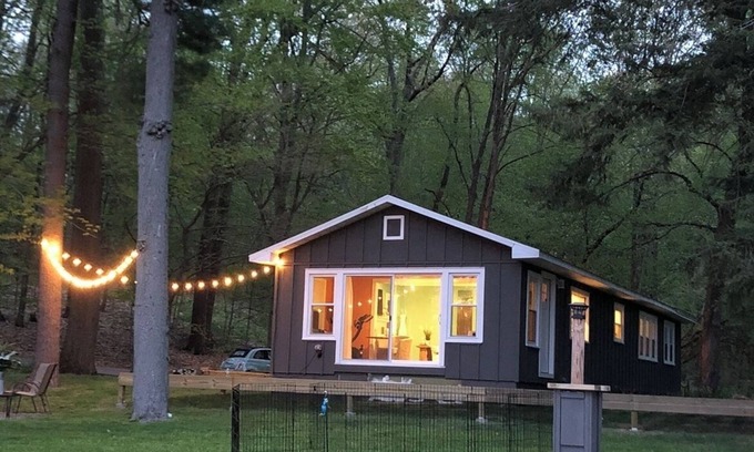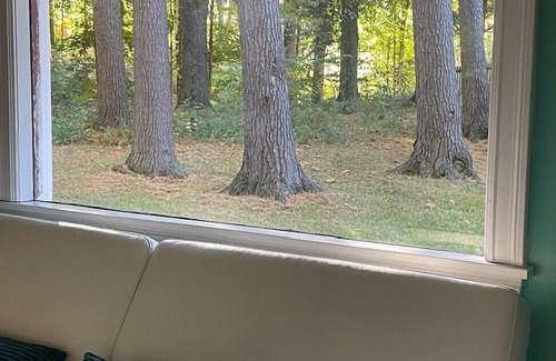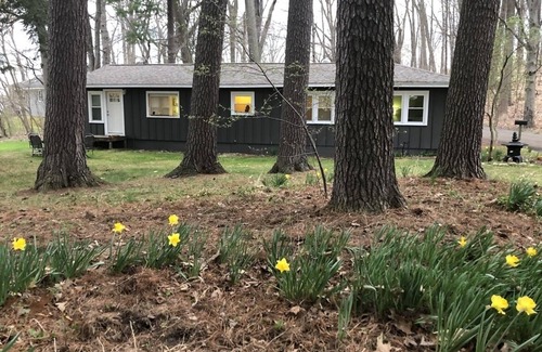 Quaint, cozy cottage is a true treasure! While a lot of places on a lake are right next to each other, this property is a truly private oasis, set back in the cove, surrounded by trees and located on a dead-end road with only woods across the road. The cottage has been completely renovated and updated, and from the moment you walk in the door, the vibrant colors make you feel cheerful. We call it our "happy place." It has a welcoming mud room with cubbies to put your shoes, and hooks to hang your coats. There is a convenient washer and dryer in the mud room. There are two welcoming bedrooms, one with a full bed with views of the woods and tall pines, and the other with a queen bed with a view of the side yard. Both have ample storage space in the closets, bed frame drawers and nightstands so you can make yourselves at home. There is also a double futon in the front room and a queen sized air mattress for two additional guests. There is one full bathroom. There is a galley kitchen with built-in banquette seating in the dining room. The table is on wheels for easy access to the corner seating. The living room is very cozy with modern amenities, including a couch and love seat and swivel chairs to face the tv or the lake. It is tastefully decorated with metal and wood wall art and built in book cases filled with books and games for your enjoyment. There is a bonus room off the living room for reading and relaxing or just viewing the cove. A sliding glass door opens up onto the phenomenal 700 square foot deck that offers outdoor space with a grill and refrigerator and spaces for gathering, eating, relaxing and making life-time memories. Steps off the deck lead to a stone fire-pit with additional seating, and outdoor lighting to set the mood. There is also a dock with a small table and chairs to have coffee in the morning. Although pets are not allowed, there are enough creatures to keep you company. From the cove you can sit back and listen to the bullfrogs, watch the blue herons, and fish from the dock. Although we don't allow people to bring in their own boats to this private lake, there are kayaks, a pedal boat, and a small fishing boat with oars for use to explore the lake. The pedal boat holds 4 people up to 800 pounds and has a platform from which you can dive off of, and a ladder to climb back up on. You can also fish off the pedal boat. Also, it’s important to note that there is no beach or recommended swimming in the cove, but the pedal boat allows you to get to the open lake for a refreshing swim. There is also a "Point" on the lake where people can go to swim that is shallow and people also dock their boats or enjoy floating. This is truly an oasis. Looking forward to your visit. You won't be disappointed with this cozy cottage retreat to replenish your spirit!
