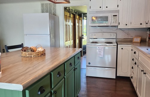 This 2 bedroom, 1 bath cottage is the perfect place to relax and unwind. The kitchen is fully stocked with basic cooking utensils, salt and pepper and Olive Oil and has a large island with additional bar seating. The dining room table boasts a stunning view of the lake!