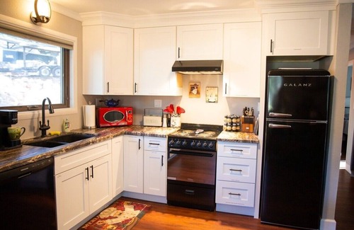 Enjoy our 2 bedroom, 1 bath home. The interior was completely remodeled in 2022 with laminated wood floors, rich crown modeling, baseboards and picture windows by Anderson. The kitchen boasts of a retro style with new cabinets and a counter top with character. The bathroom includes a huge jacuzzi tub. Comfortable Tuft N Needle mattresses with adjustable electric bed frames (King & Queen beds). Electric fireplace, 50" TV, Netflix, Roku, Alexa. Sleeps 5: King/Queen beds, plus ottoman Twin bed