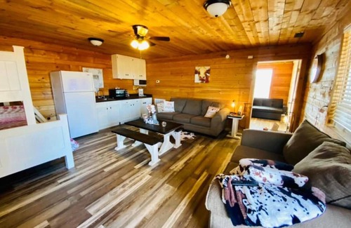 Our one bedroom farmhouse has bunk beds and pull out sleepers to comfortably sleep 8. Perfect for families! Enjoy our cow, emu and NINE piggies! They love to get treats.
