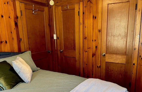 The bedroom has a very comfortable queen bed with a sealy mattress. It's brand new. Brand new pillows, one type memory foam, the other type a plush support pillow. There is a view from the bed to the back woods and the running stream. The bathroom has been remodelled and includes a rain shower, sink and toilet with a view to the back woods and stream.