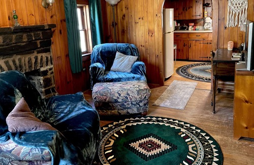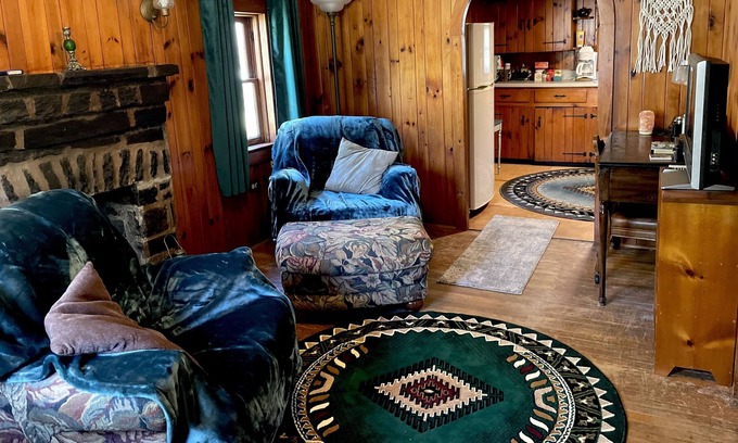 Authentic log cabin with a newly renovated bathroom. The new bathroom has a rain shower! The property sits on about 1 acre of land complete with a rushing stream which you can hear from the back screened-in porch. You are free to walk down to the stream and make use of the two small beaches and large rock on the stream. Some love to sit, read, or picnic on the rock or mini-beaches.