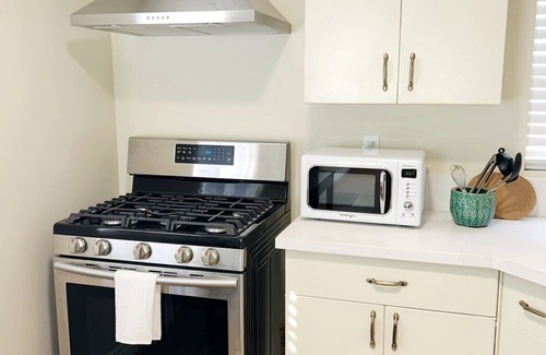 You'll be greeted with serene decor and a light & bright vibe at this Kensington gem! Outside you'll find a cozy, private seating area, surrounded by plants. Inside, you walk into the bedroom which has a queen-size bed facing a smart TV with all the streaming apps. Turn left, and you're in an adorable, well-stocked kitchen made for two. The back hallway leads to closet space and a bathroom complete with shower-bath combo.