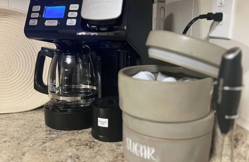 Kitchen: fully stocked with microwave, coffee maker for K-cup and ground coffee, toaster, mini waffle maker, and mixer.
