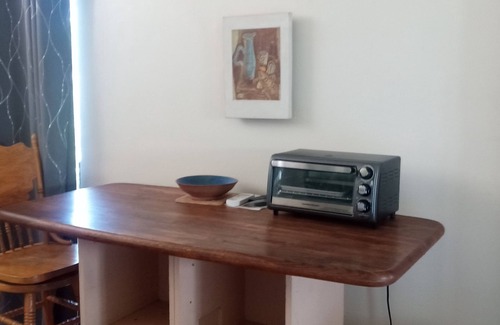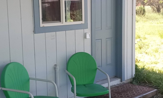 Quaint pet friendly studio with AC and WiFi on a 20 acre parcel in Upper Lake. Two large south facing sliding glass doors bring the outside in. There is a covered gravel patio area with chairs and a picnic table where you can enjoy the view. You can walk your dog out the driveway and up into the forest and not encounter any cars. There are two other dogs on the property so introductions would need to be made. There is a loft with its own window that could be a purrfect place for a cat nap, for human or feline. The kitchen has a full size refrigerator, stove and microwave. It is fully equipped with everything you might need including a coffee maker, a tea kettle, eating utensils, a set of pans, and more. There is a bar table with two stools and storage underneath, an amoire with about 2 feet of clothes hanging space and several shelves. A love seat is placed with a view out of both sliding glass doors. The queen size bed is in a nook formed by the small loft that is 6 feet overhead, It is a short drive to Sutter Lakeside Hospital and about 20 minutes to Lakeport.