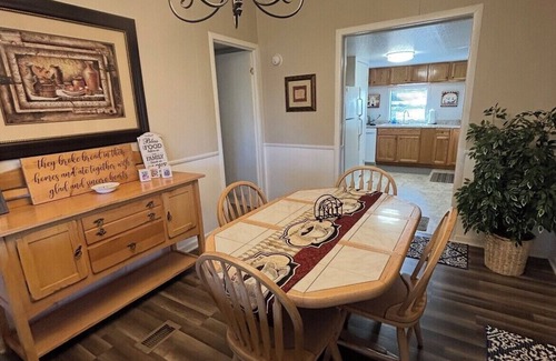 If you love spending that quality time together, head outside to the fire pit and enjoy s’mores, story-telling or just friendly conversation. Later in the evening, head inside and finish off the night with some more friendly competition while playing board or card games at the dining table or just snuggle up in the living area outfitted with two sofas, both boasting cozy reclining chairs, a warm wood-burning fireplace and a movie from our family-friendly DVD library and watch it on our 52” flat screen TV for your viewing pleasure! Or sign in to your Netflix or any account through our Roku and watch movie of your choice!