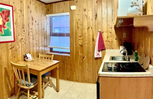 Kitchen - equipped with a two burner stovetop, microwave, sink, small fridge, and all the essentials for cooking. No oven.