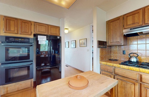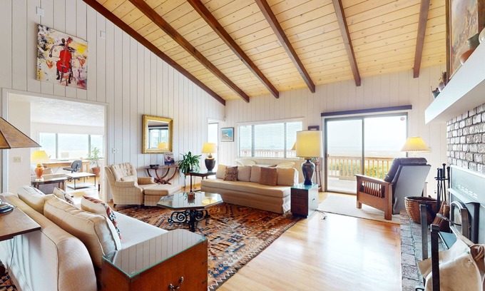 Book Humboldt Bay Retreat, a gorgeous home in South Eureka in a quiet neighborhood, and enjoy the getaway of a lifetime! This vacation rental near the ocean features an eclectic décor and hints of Midcentury-modern with vaulted ceilings, original art, and relaxing common spaces. Wind down by the wood-burning fireplace and read a good book or enjoy an engaging conversation with your guests. The common spaces are spacious and inviting with ample seating, hardwood floors, and unique pieces. There's a formal living room, a family room with TV, a formal dining area that opens to the living area, and a breakfast nook. The deck boasts a convenient outdoor dining area with marvelous valley and bay views. This place is ideal for families, couples traveling together, or just a couple that would like more space and great views.