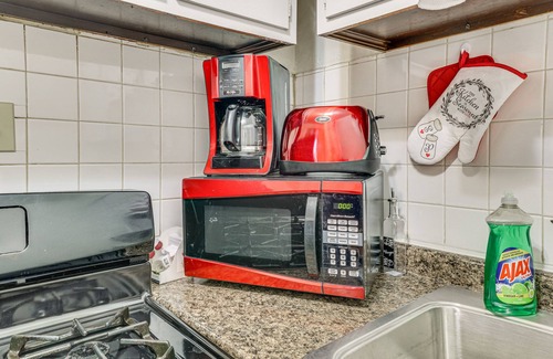 KITCHEN: Refrigerator, stove/oven, drip coffee maker, microwave, dishware & flatware