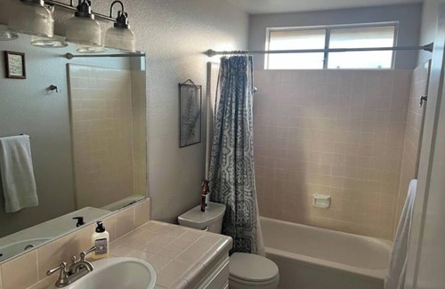 This house has four bedrooms, two bathrooms with ceiling fans throughout. Each room and bathroom is tastefully furnished and move in ready with basics supplies ( including towels, toilet paper, cleaning supplies ect.). The bedrooms each have queen size luxury hybrid mattresses with large amounts of usable closet space. The living room is cozy and furnished with beautiful art, couches, a fireplace, TV ect. The newly remodeled kitchen is a guest favorite, with new appliances and is also fully equipped.