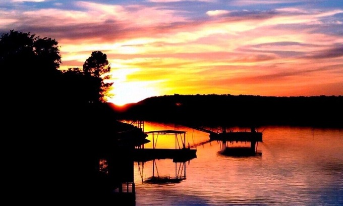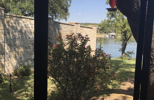 DEEP WATER/NO WAKE ZONE! Lakefront home, beautifully situated on .66 acres privately gated, double deck dock with dive platform, porch swing and chairs/chaise loungers on double dock, single slip boat dock (not available unless staying for extended period of time and cleared with home owner), no wake zone, open floor plan, stone indoor and outdoor fireplaces, gas fire pit coffee table, outdoor gas grill, outdoor gas griddle, screened in porch with dining area, newly remodeled kitchen and furnishings, newly remodeled bathroom, original artwork, gorgeous furniture and decor, beautiful old trees, tetherball, & Deer frequent the front yard. The sunset from the top of the Dock is absolutely breathtaking!