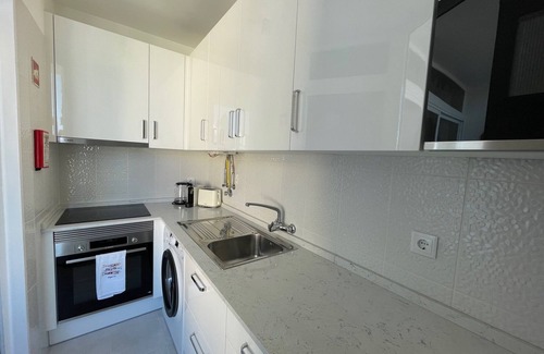 The apartment is designed for comfort, blending calming beige tones with fresh coastal blues. The recently renovated kitchen is fully equipped for those who prefer to dine in, including a small fridge with freezer compartment. Local supermarkets are just a five-minute walk away, and larger grocery stores in Quarteira or Almancil are easily reached by car in under 10 minutes.