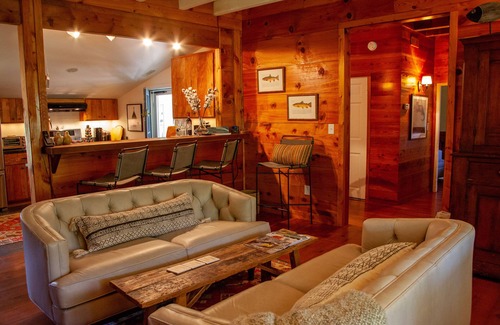 Quarry House is one level with 3 bedrooms consisting of two queen beds, a king bed and 2 full bathrooms. The "new" wing of the home contains a master king bedroom and queen bedroom with a shared full bath with walk-in shower splitting the two rooms. The other wing contains a queen bedroom with fireplace (decorative only) and a shared full bathroom with a walk in shower. Splitting the two wings is a fully stocked kitchen with all the cookware and appliances you'll need and a living room containing a fireplace, flat screen tv and ample seating to enjoy each other's company.